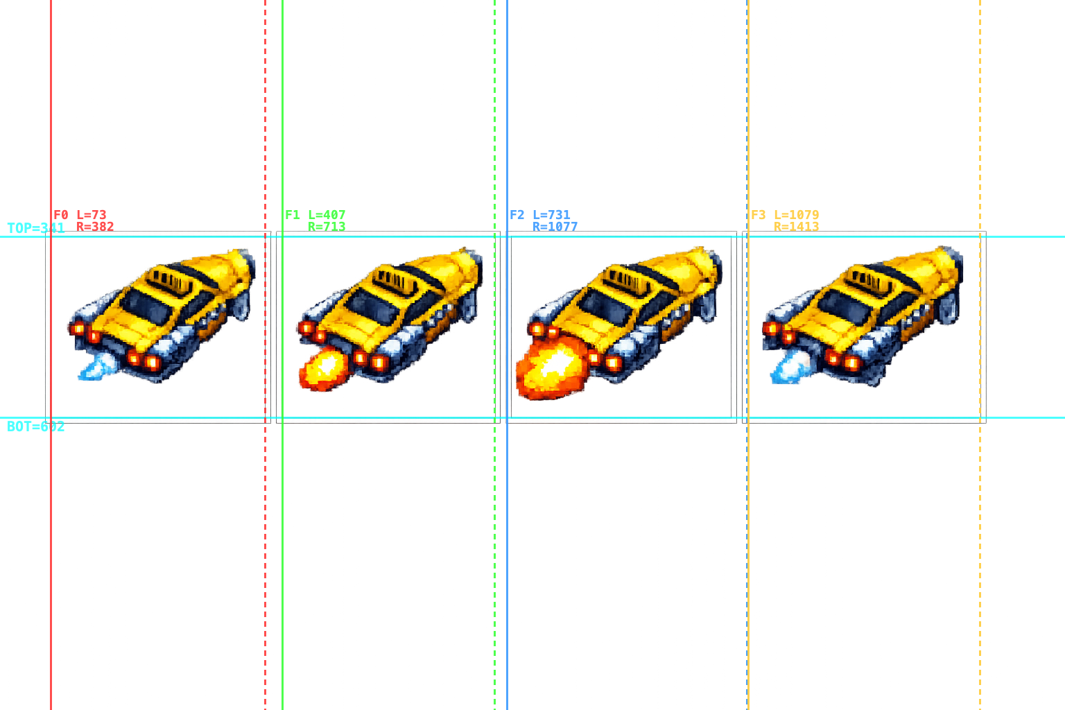 Registration lines from rank-8th.edn. Verify car body aligns across all frames. If not, adjust EDN and re-annotate.